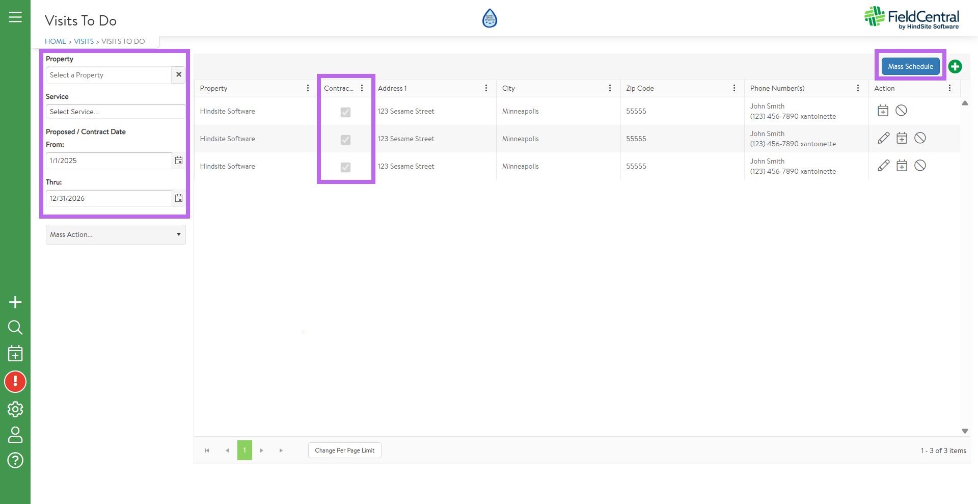 From this log the user is able to filter as needed and if desired they can “Mass Schedule” or create routes in RouteBuilder if the contracted work is set as recurring.