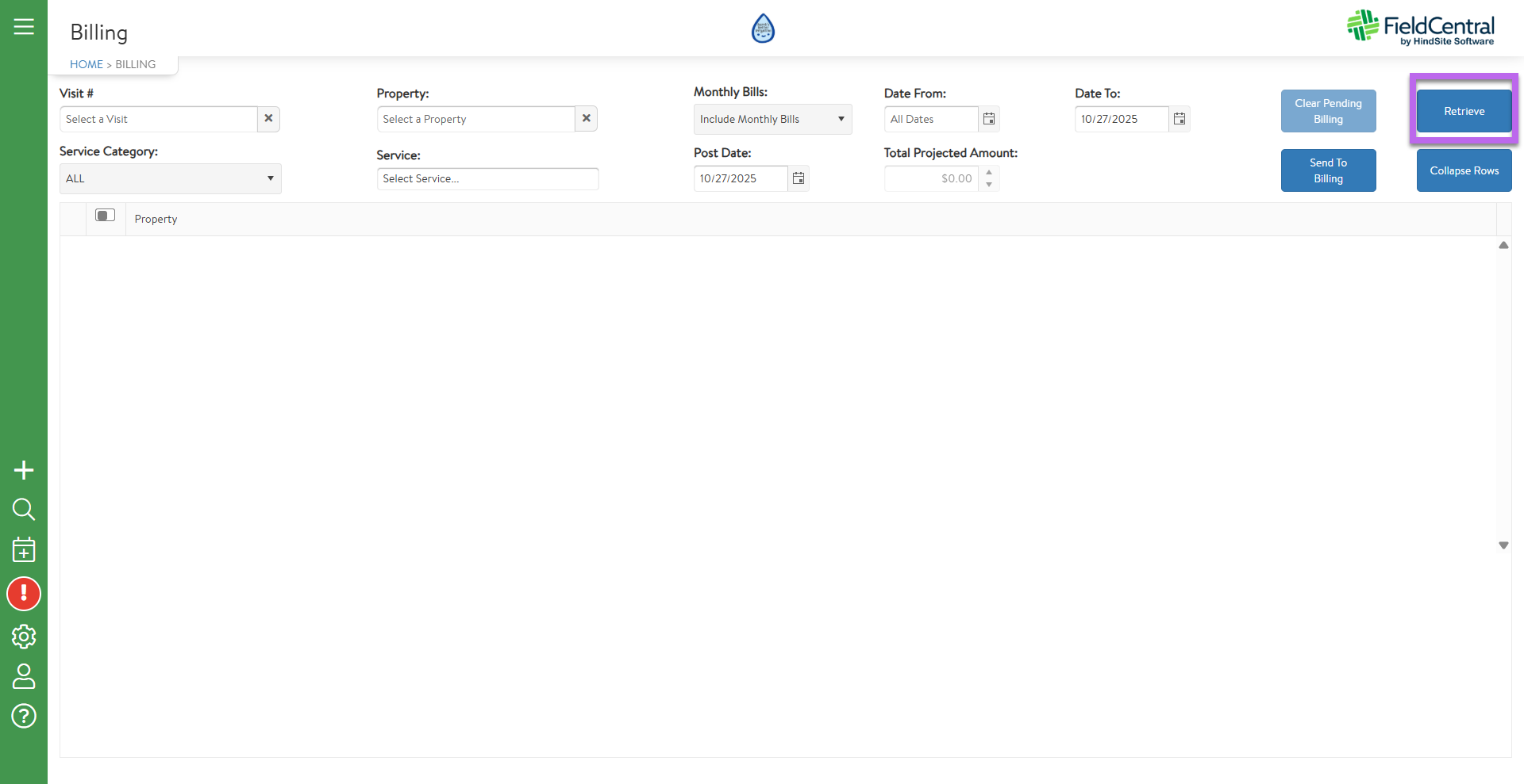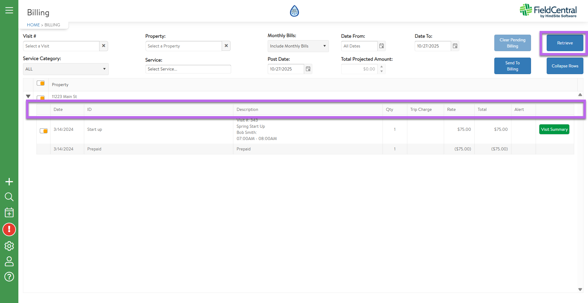Adjust any of the parameters to pull the desired list of visits ready to be invoiced and then click “Retrieve”.