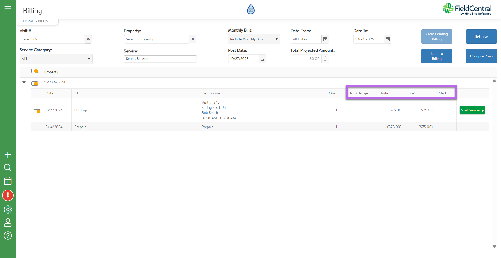 Based on the parameters established, a list of properties and their completed (not yet invoiced) visits will be displayed.