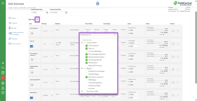 Services can also be added from other categories by selecting the pencil icon and checking/unchecking the boxes of what services to include in this estimate.