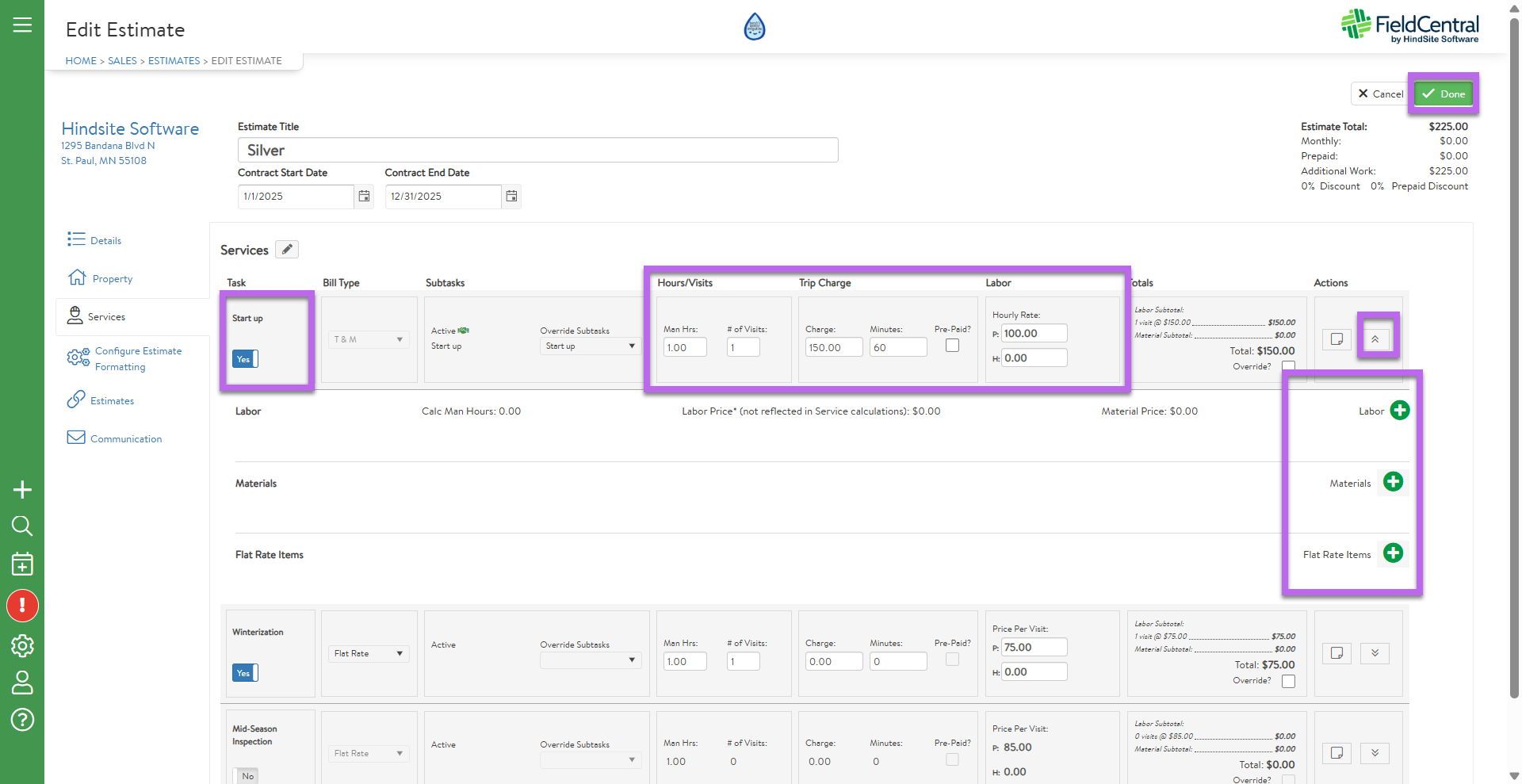 The selected Services will allow the user to adjust billing details for this estimate as desired. Additionally, the user can click the arrows on the right hand side to drop down additional pricing options for Labor, Materials and Flat Rate Items. Once all adjustments have been made, the user will click “Done”