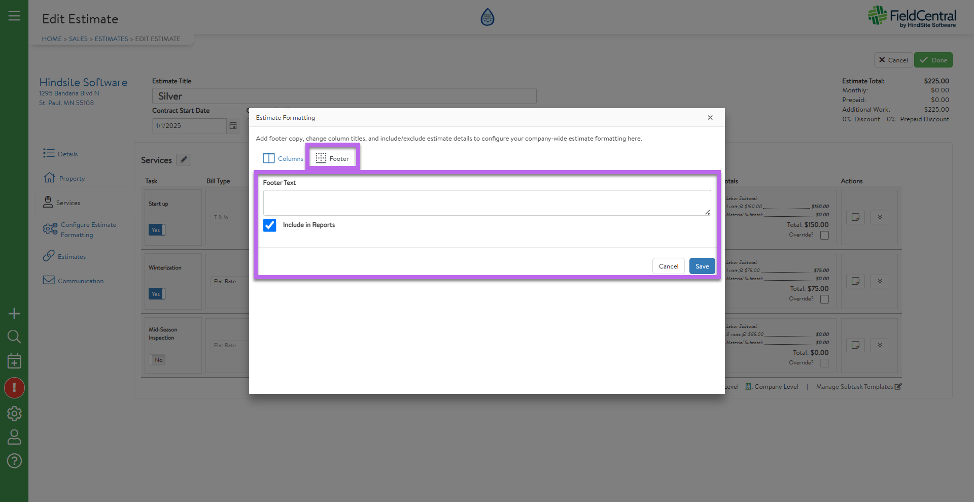 To make any adjustments to the Footer of the estimate, users would navigate to the "Footer" tab of the pop up window and then click "Save"