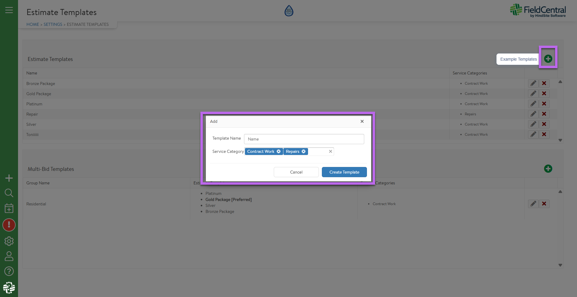 To create a new estimate template, click on the green plus button in the top right corner of the page.