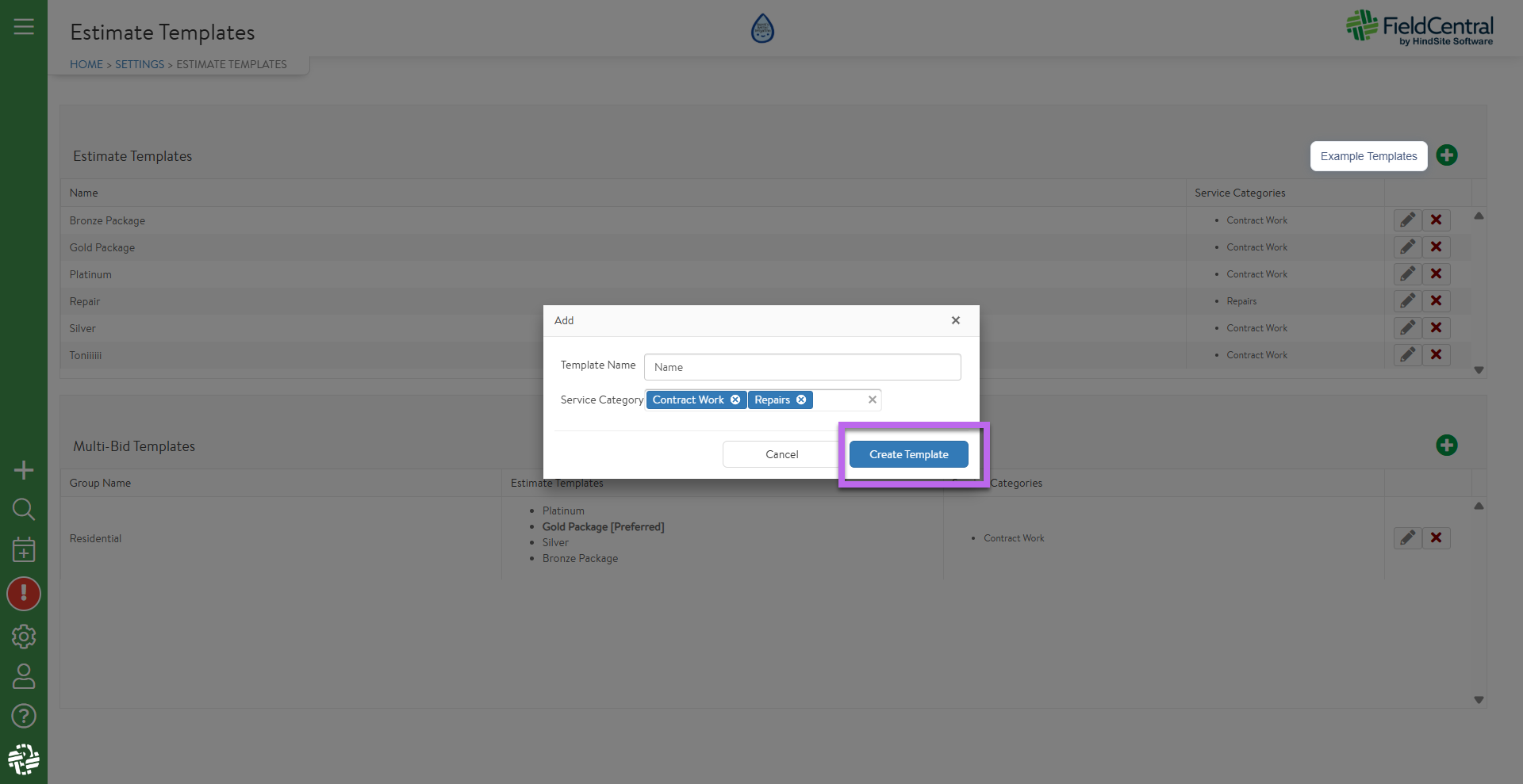 Users will first be prompted to choose their template name and one or more service category before clicking “Create Template”.