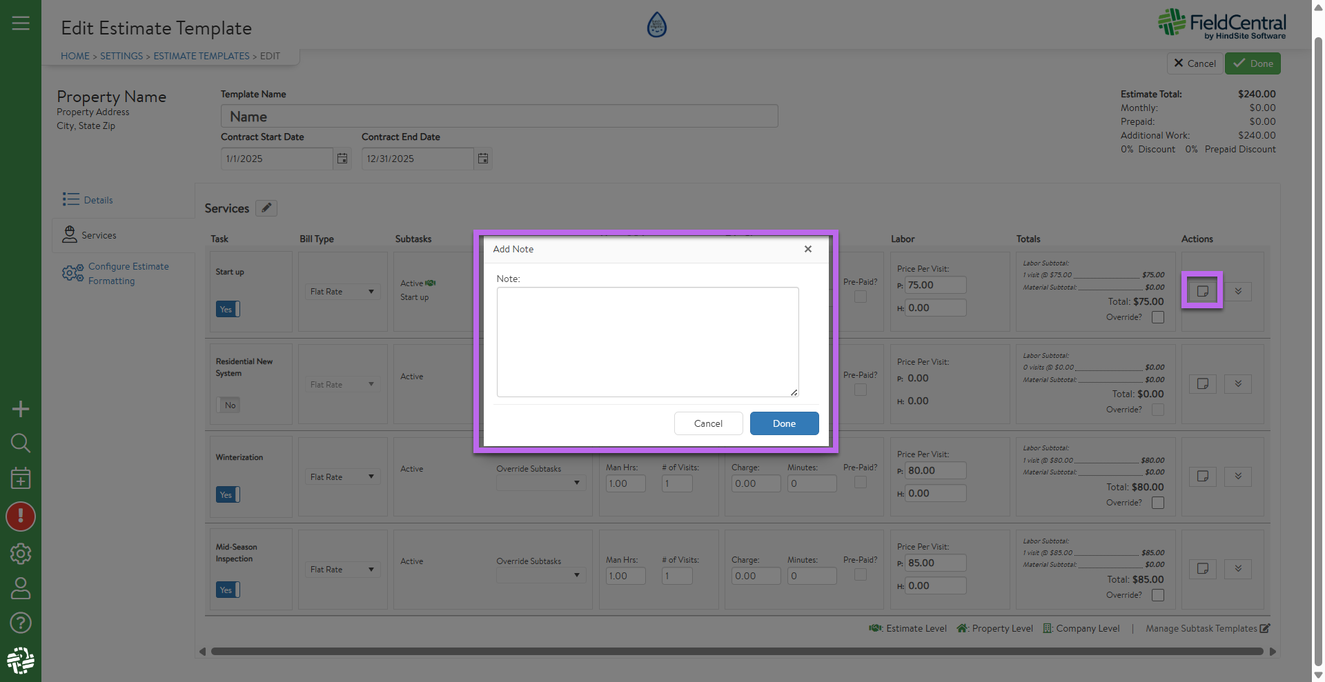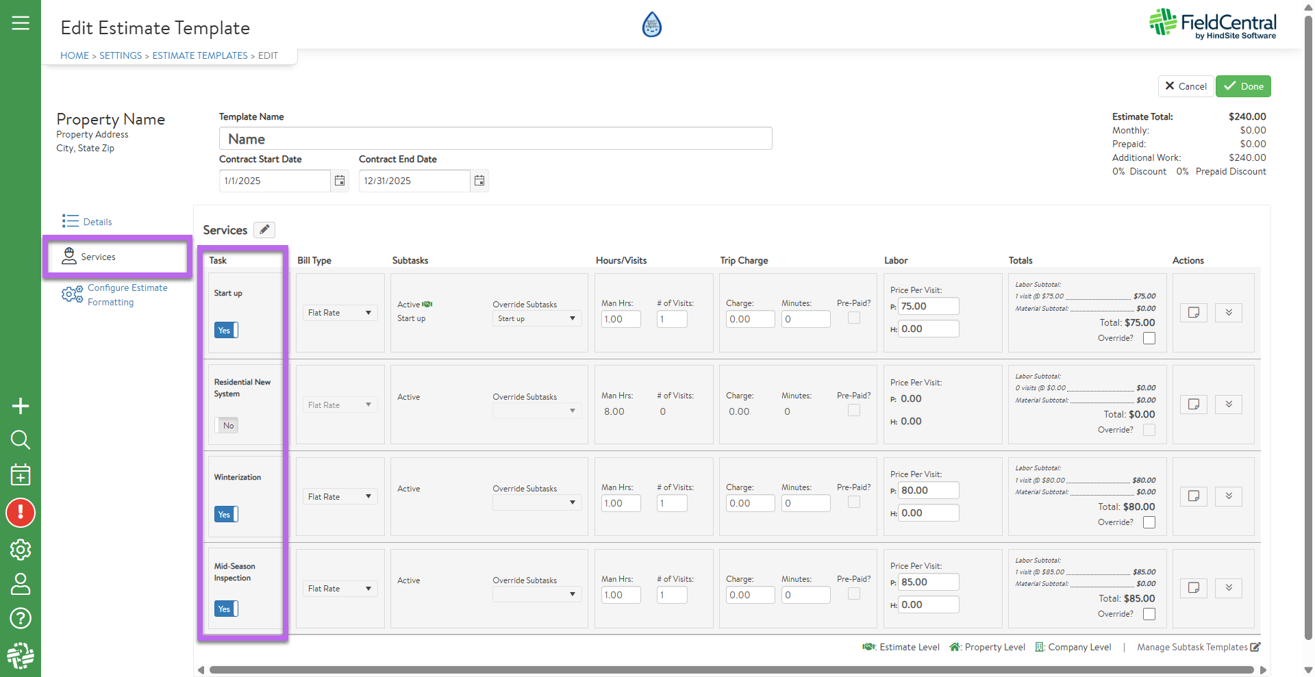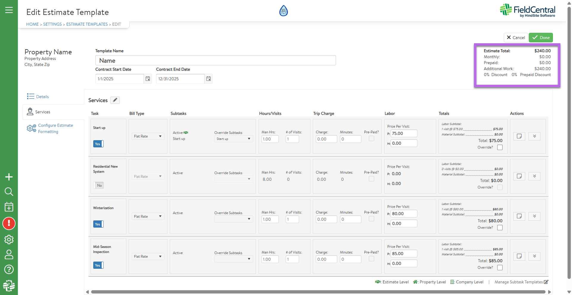 This article will cover how a user will create an estimate template by selecting the services within any category and adjusting rates as needed. Additionally, we will cover how to adjust estimate formatting before sending to any customers.