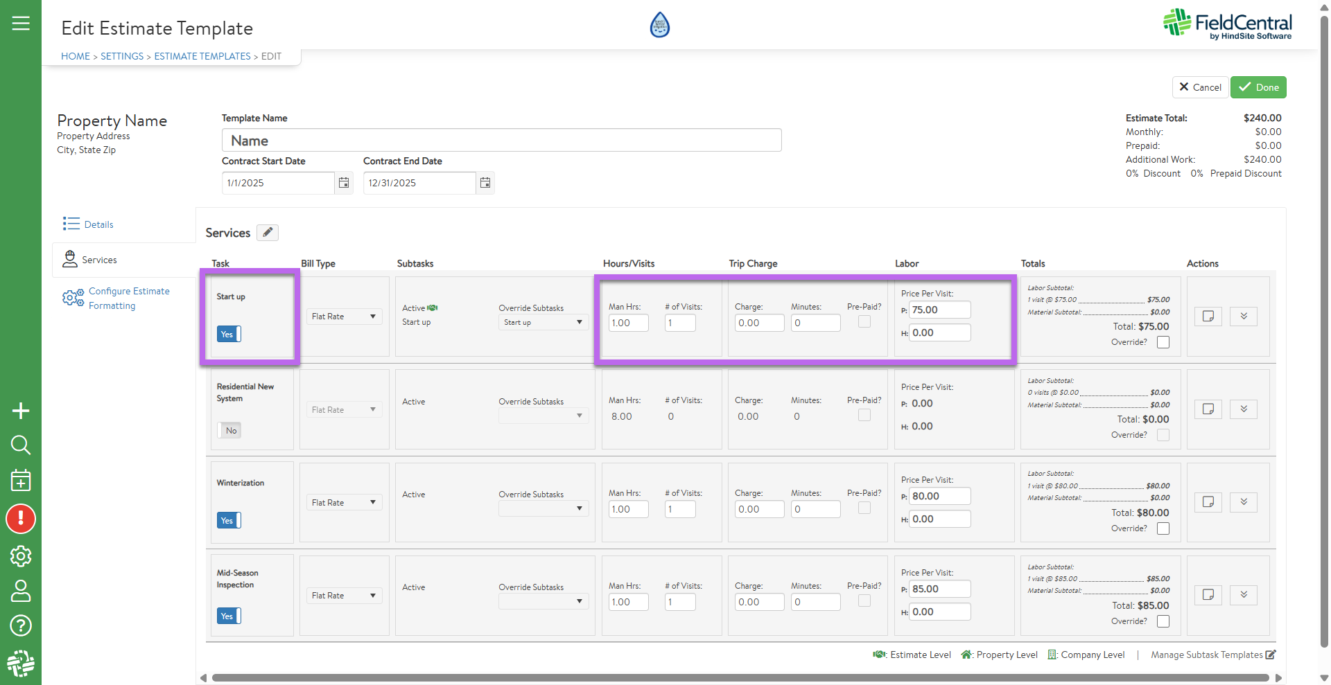 For any Service that is toggled to be included in the template, default pricing will populate but the user is also able to adjust hours, trip charges and pricing from this view.