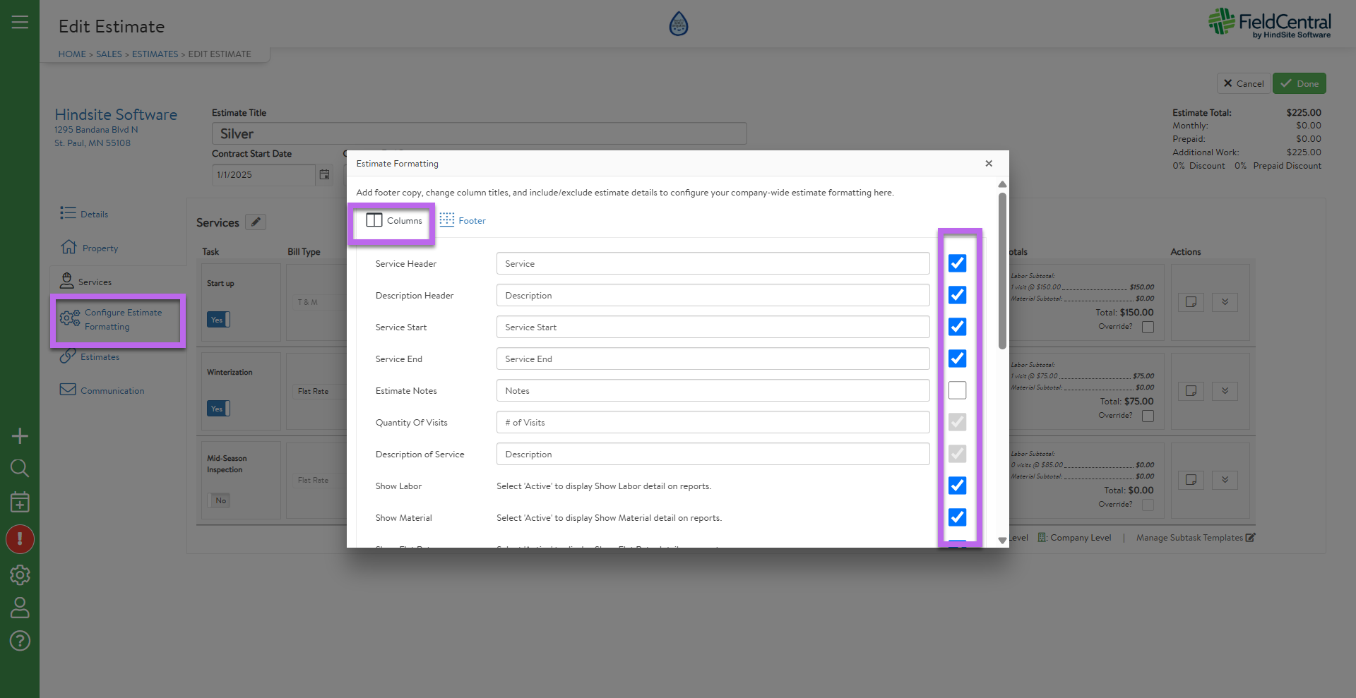 Once the services and rates are established the user will click the tab “Configure Estimate Formatting” on the left. A window will pop up where the user can choose what information they would like to display when distributing this estimate.