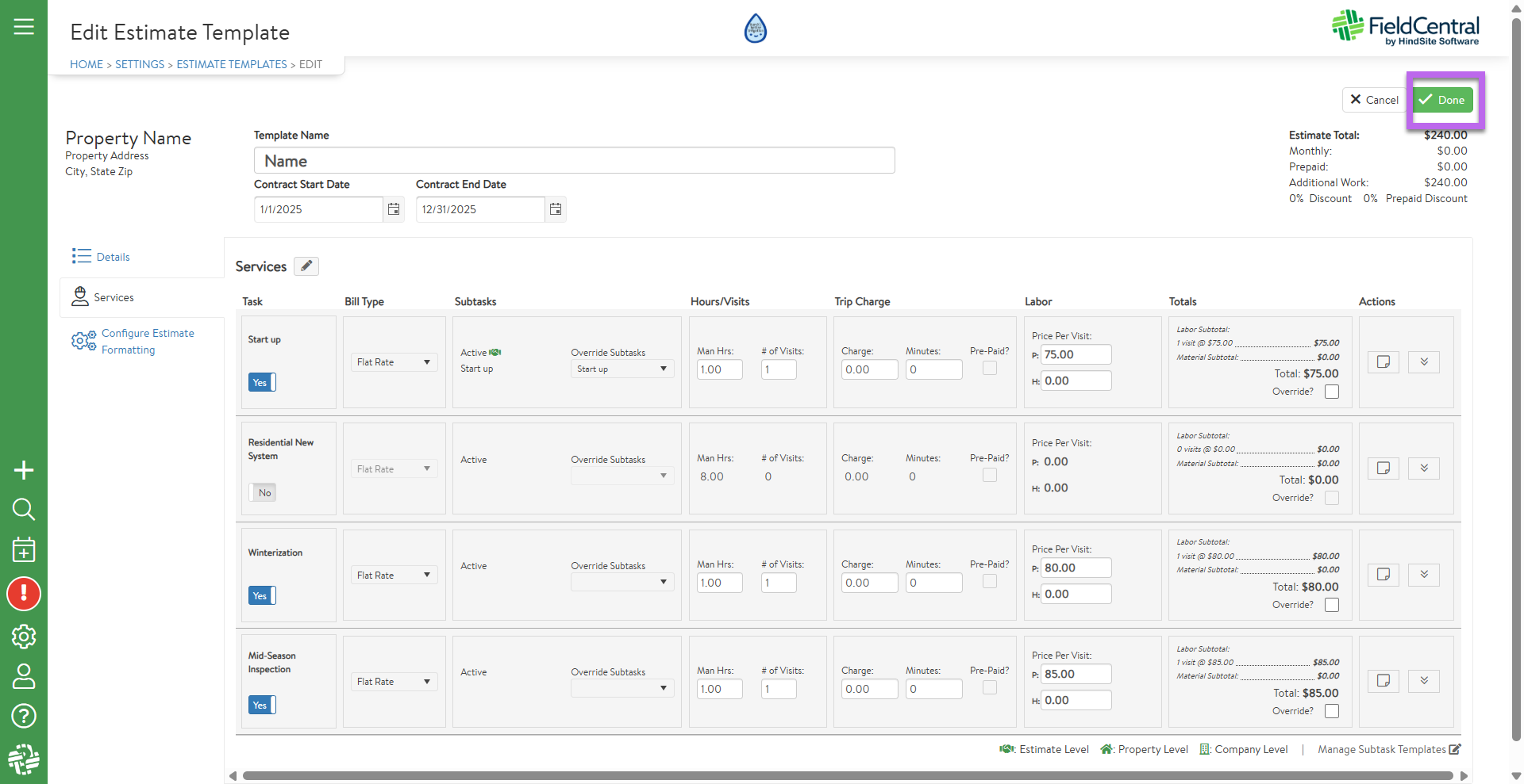 If no other adjustments need to be made, the user is ready to save the Estimate Template by clicking the “Done” button in the top right corner of the page.