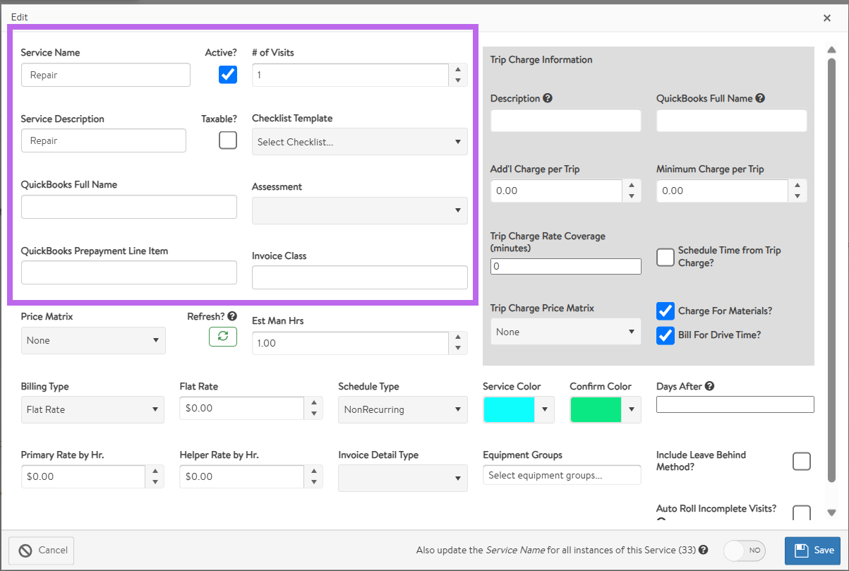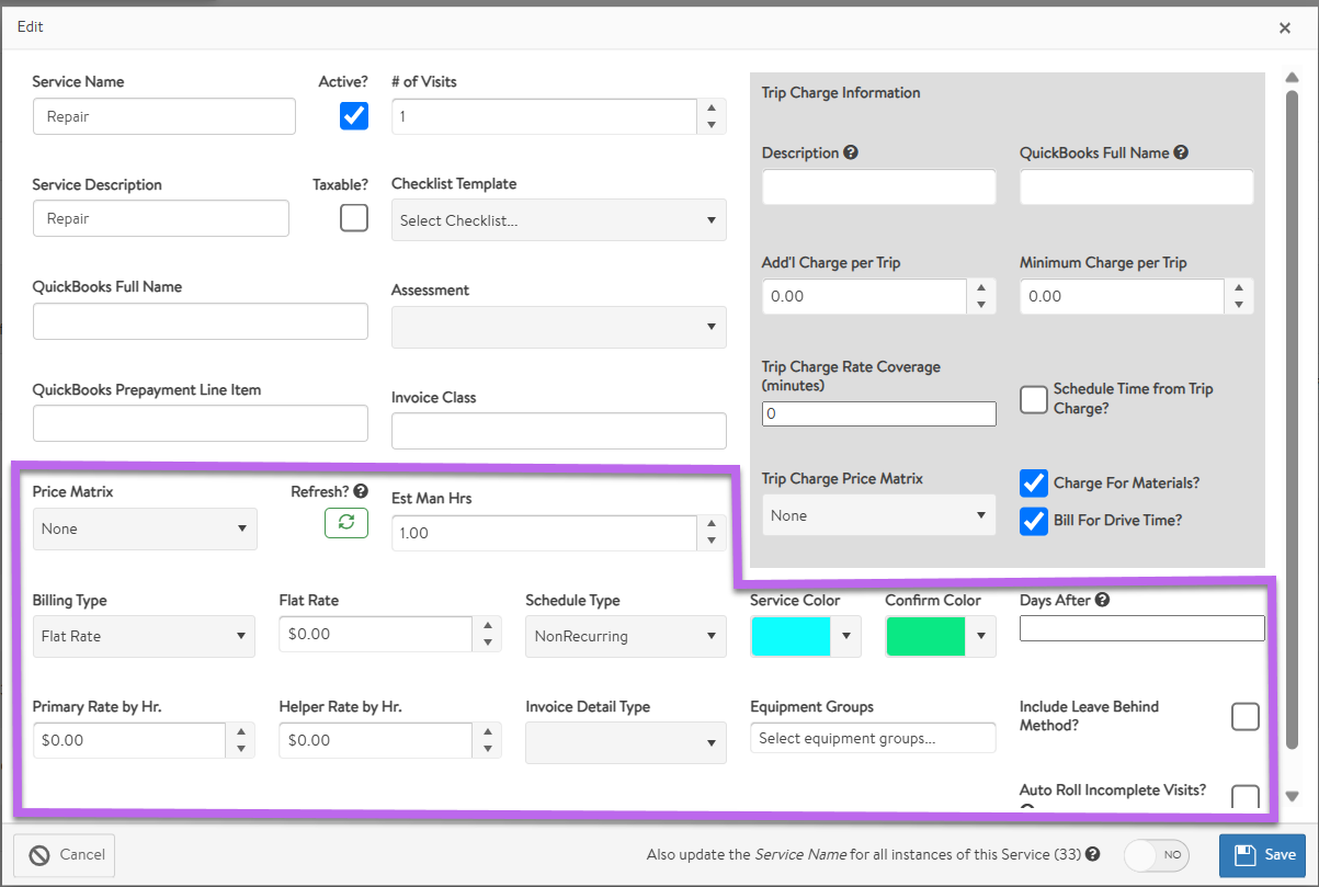 Equipment Groups: assign the Service to an equipment group based on the equipment needed to perform the service