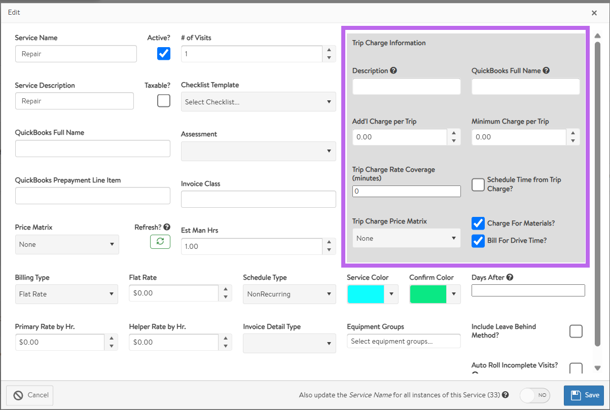 - Charge for drive time check box (if anything is filled out in the trip charge, that needs to be checked).