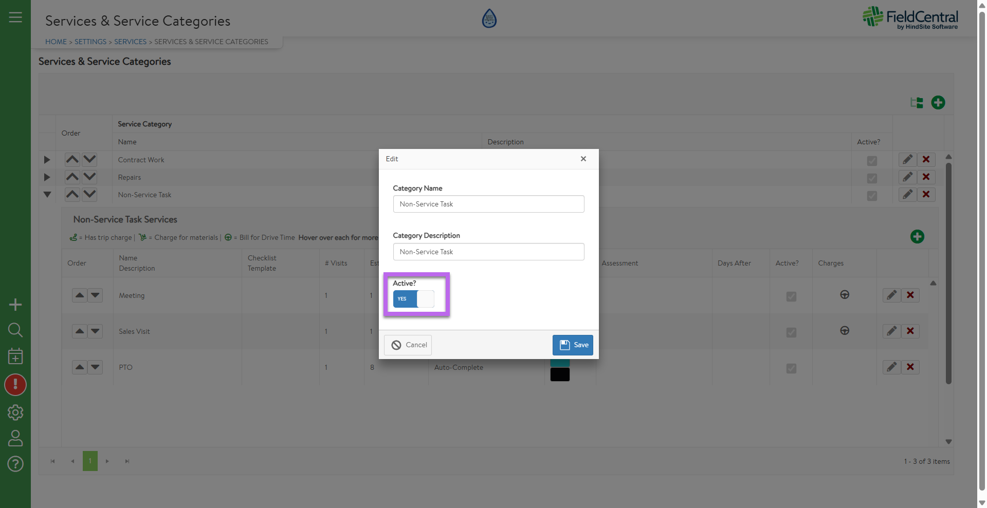 If deactivating a service category, the user will toggle off the “active” option and then save.