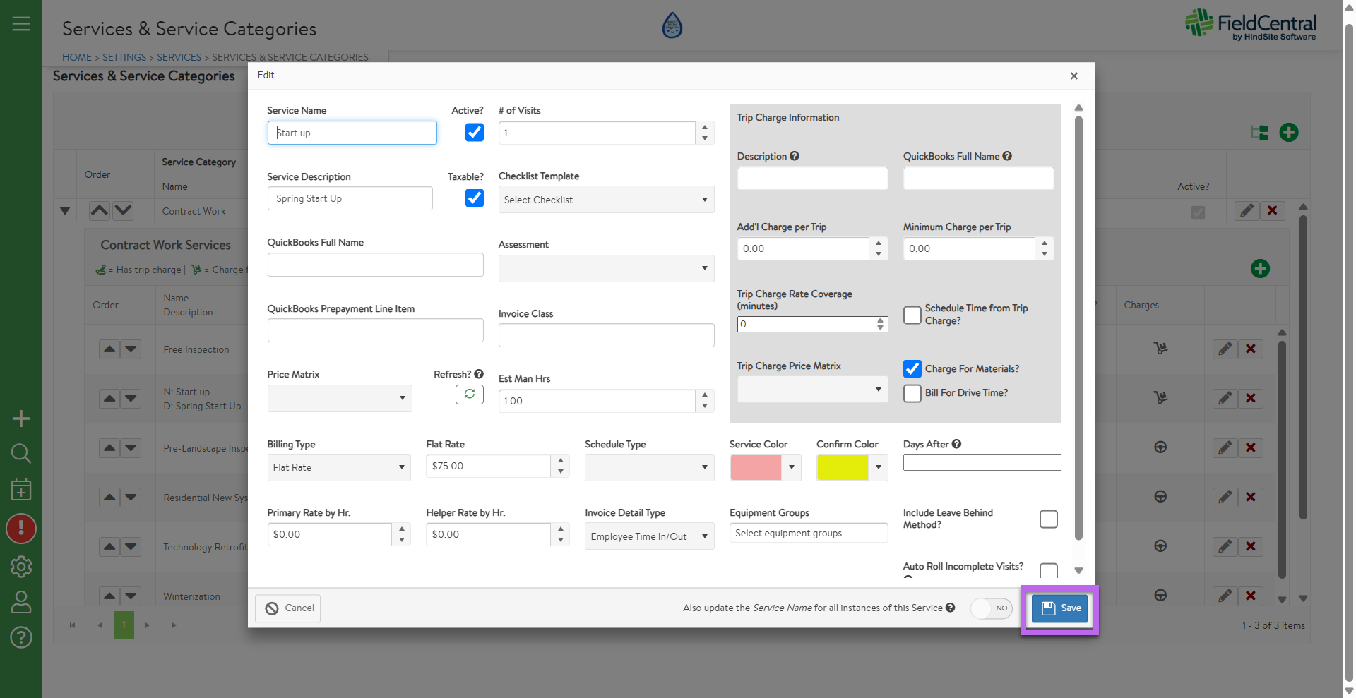 The user can review the settings and establish what they would like their default settings to be for this Service. Be sure to review the Bill Type and Rate! Once complete, click “Save”.