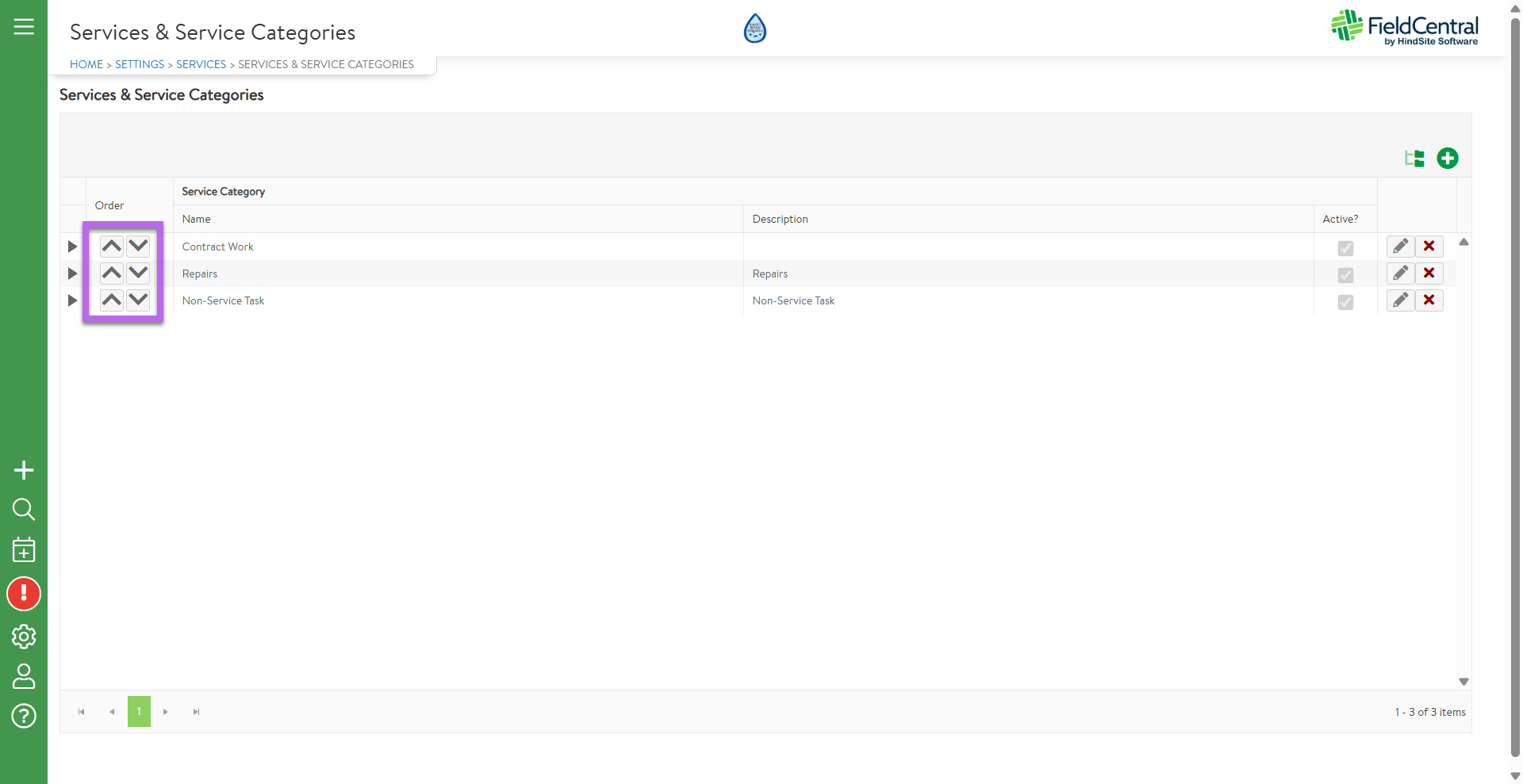 To re-order the appearance of either the Service categories or the Services within them, use the up/down arrows within the “Order” column.