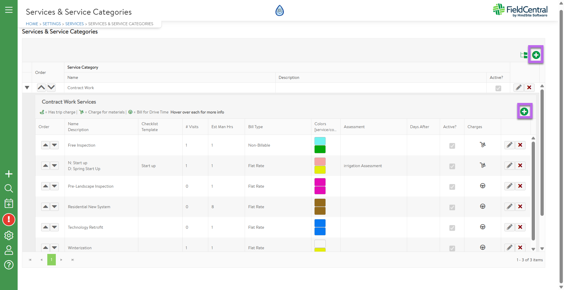 To add a new Service Category OR a Service under an existing Service category, use the + buttons on the right side of the page.