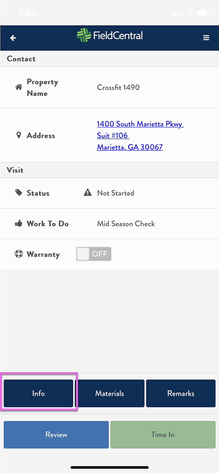 Once a technician clicks on a scheduled visit, they will be brought to the visit details page. From this point on in the visit, you will be able to add “Remarks” at any point in the visit, which will be saved each time changes are made.