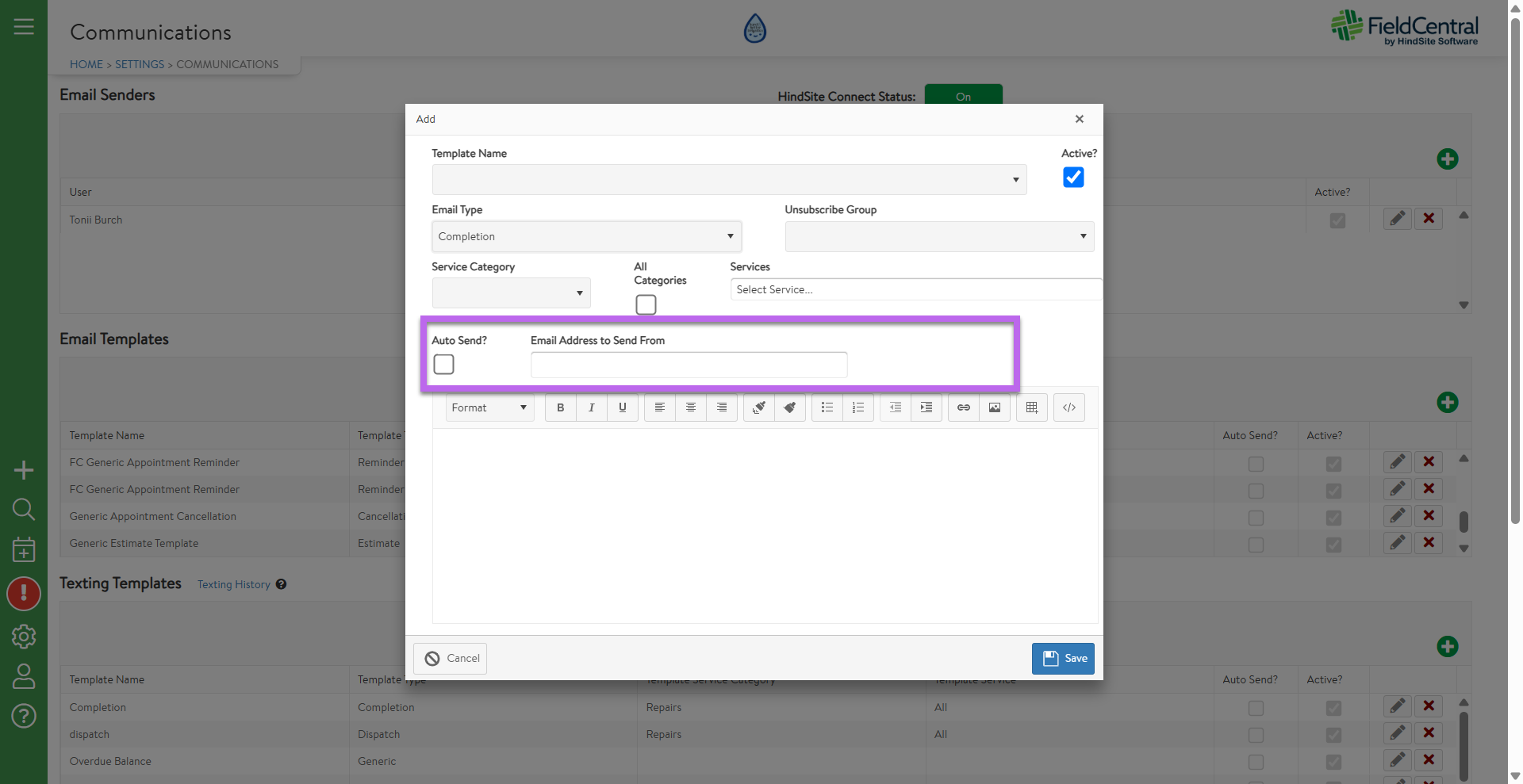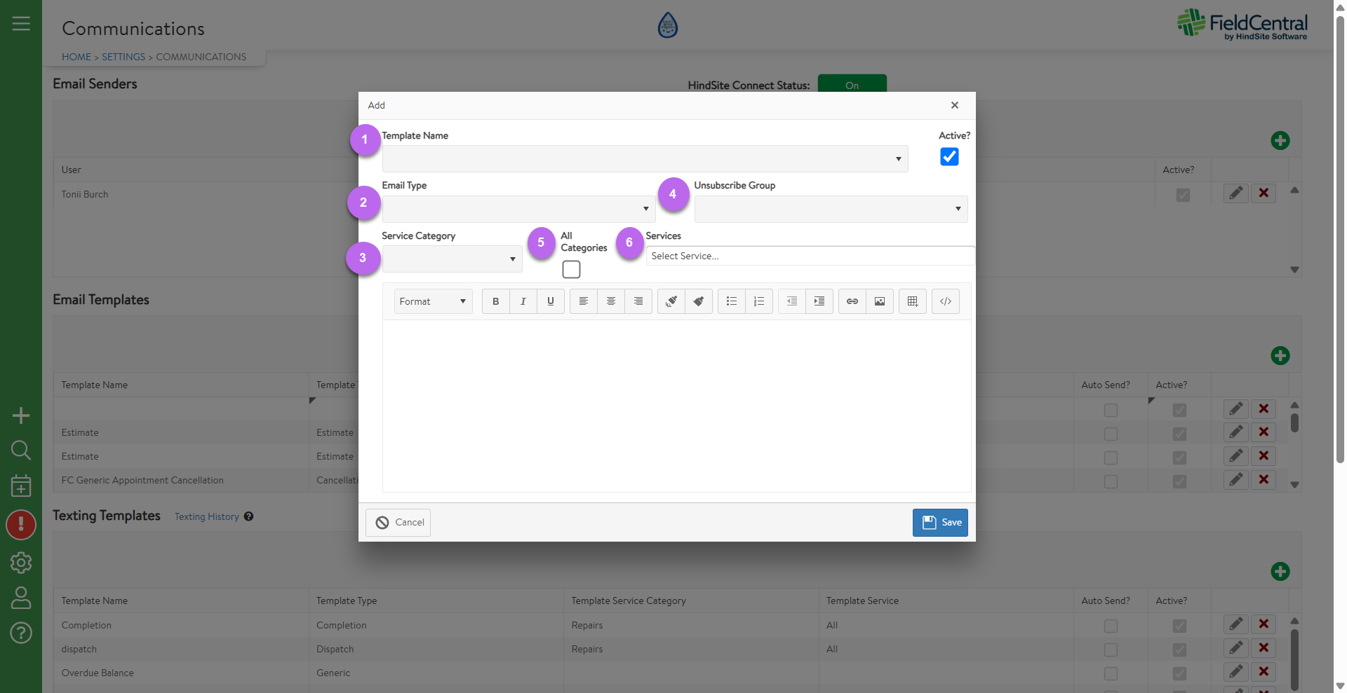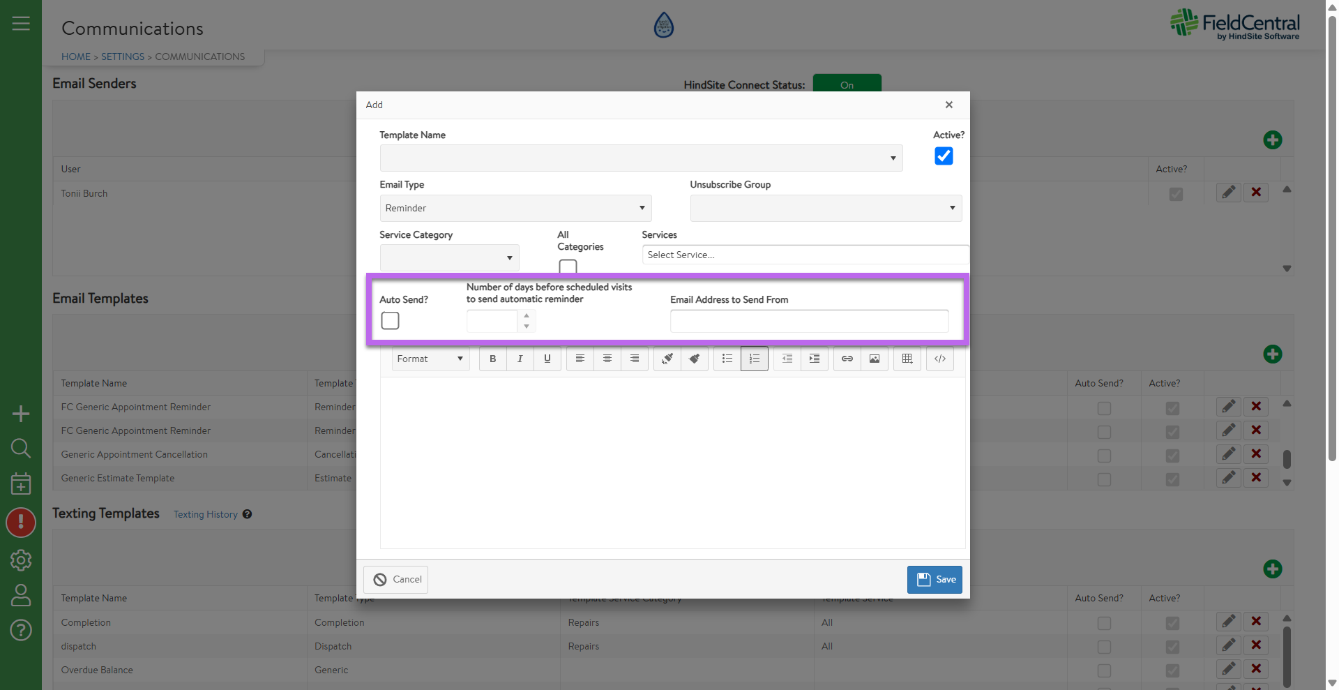 In this article we will cover how to set up email templates within FieldCentral for those who have purchased the Connect add on feature for email/texting capabilities.