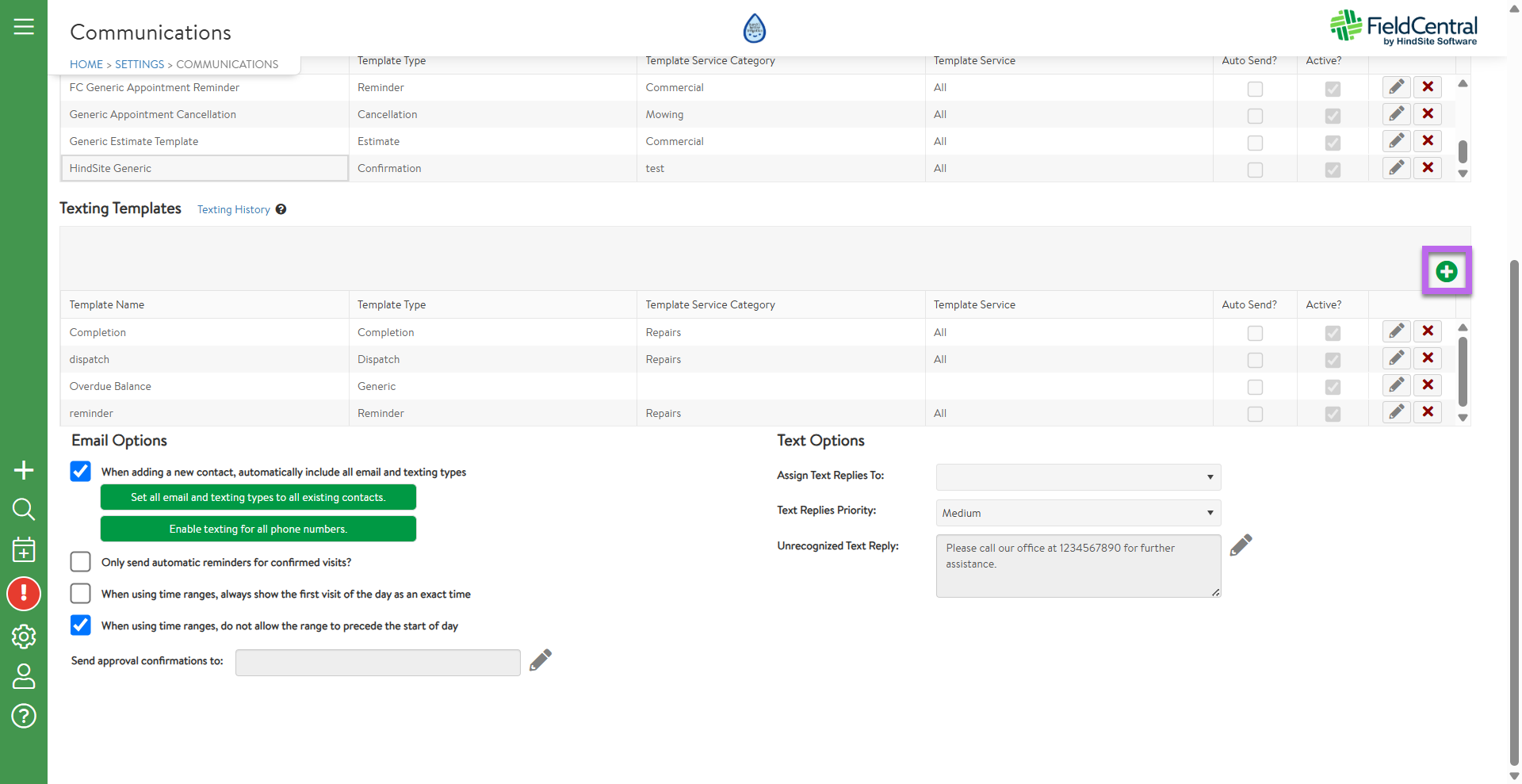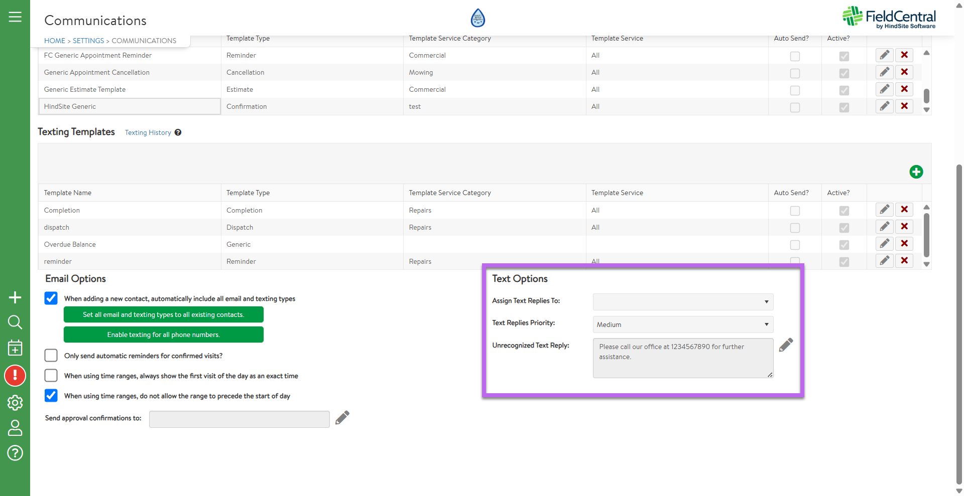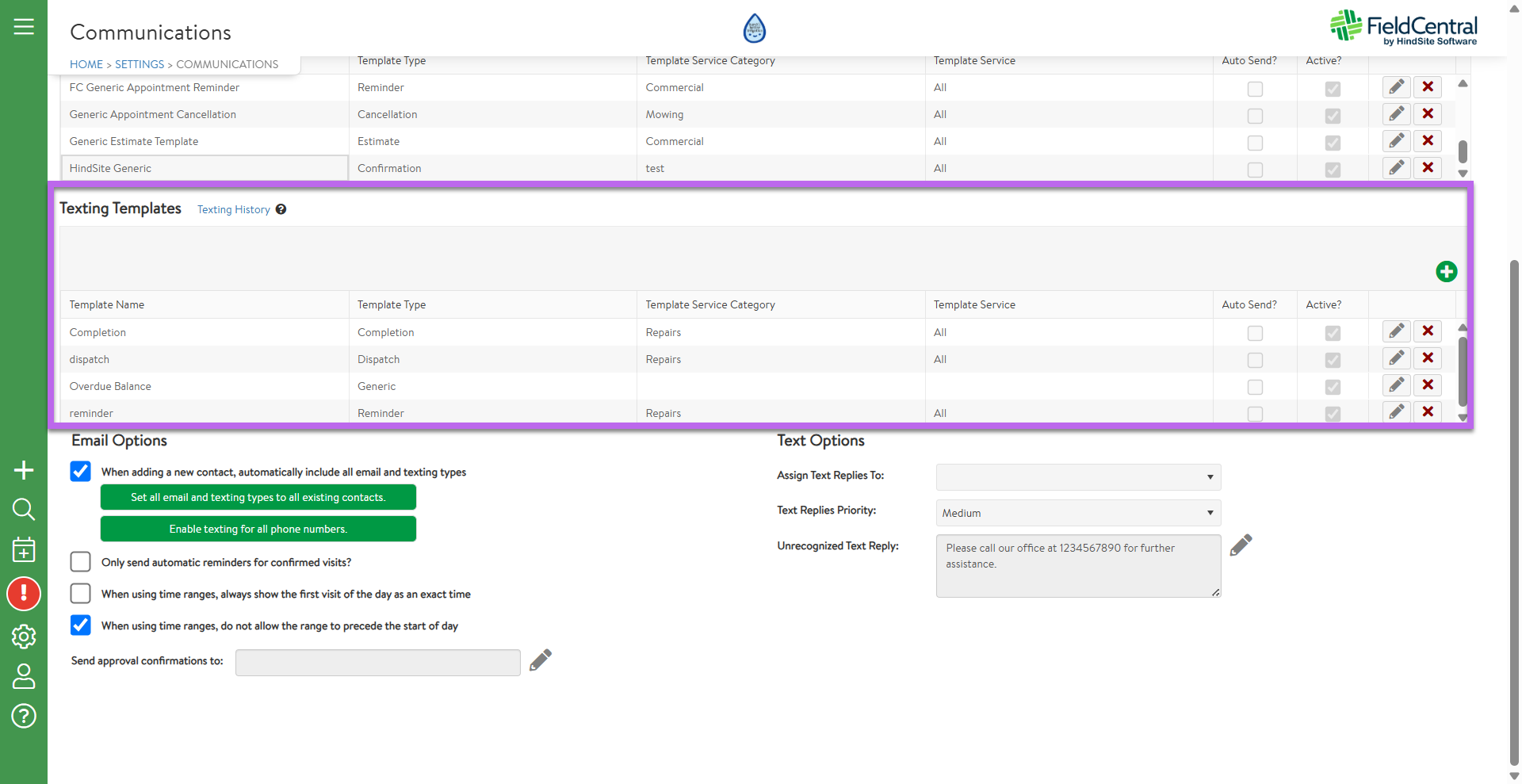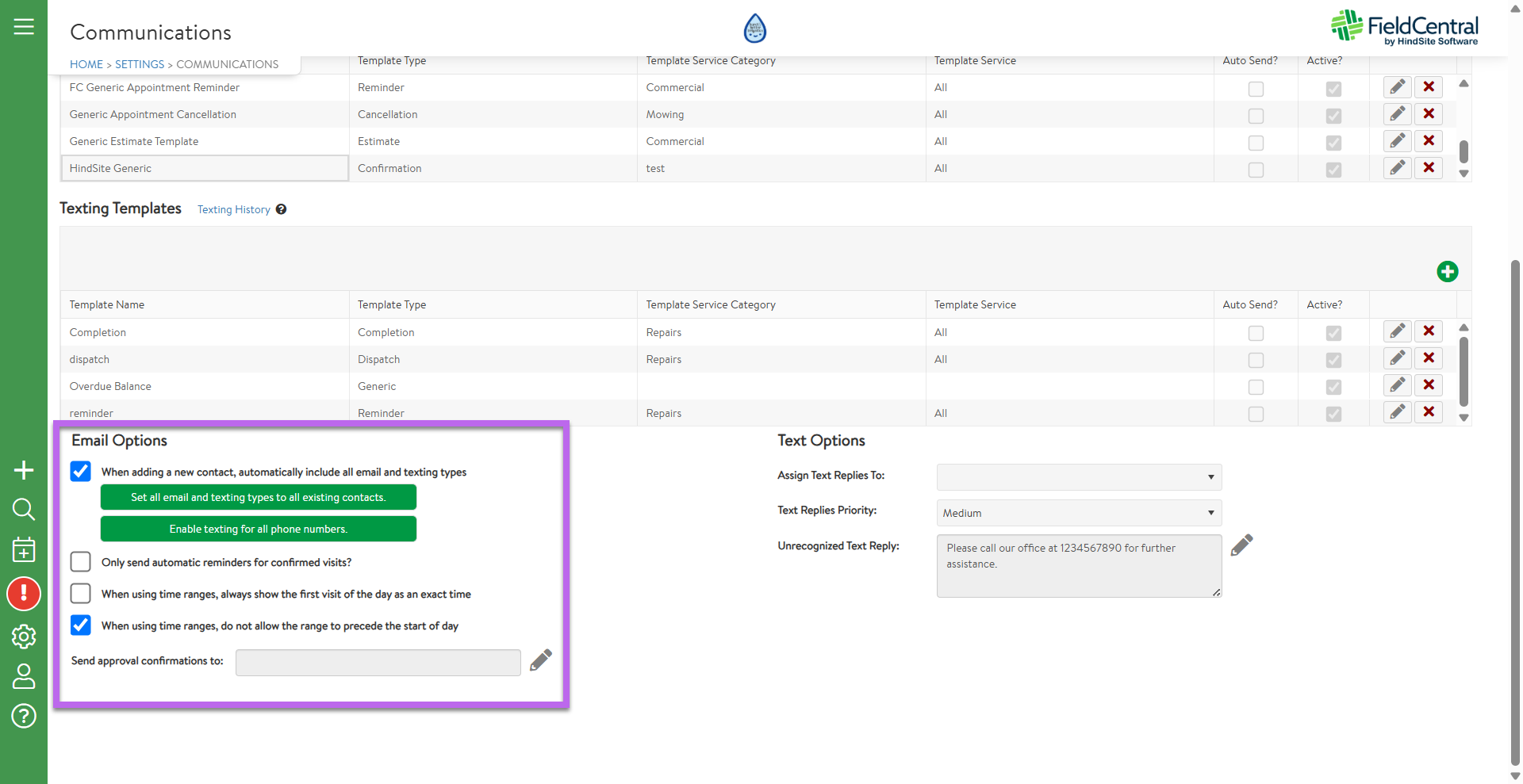 If you are a FieldCentral Connect client, be sure to checkout your Communication Settings and ensure your Texting Templates and Email/Text Setup options are set to your business needs.