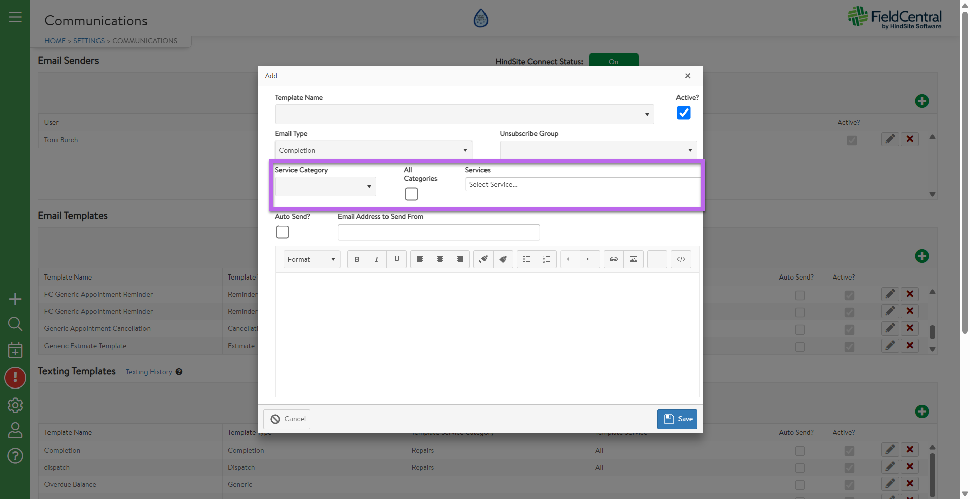 Once FieldCentral is connected to your SendGrid account you then have the ability to Select templates by hitting the green plus sign on the Templates section and then select from the ‘Template Name’ drop down.