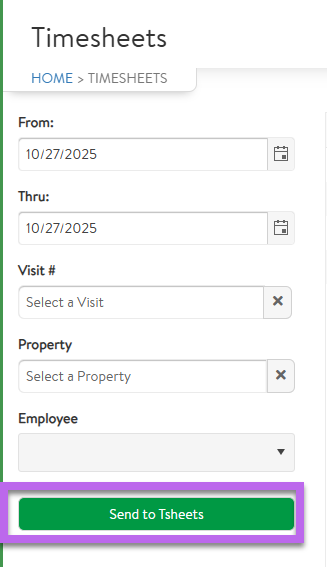 The From and Thru dates on the left will always default to the previous day and you can adjust the date range of the times you’re looking for. There are also other options to choose a specific visit #, a property, or an employee’s times using the other search fields as shown below.