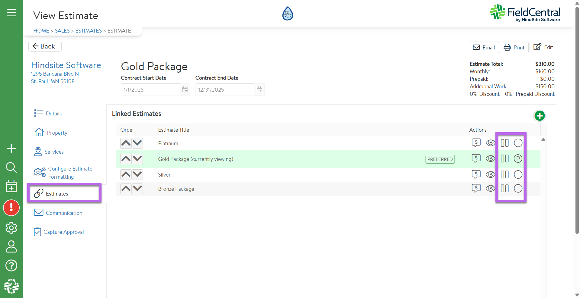 Within the “Actions” column, the user has several options to manage the included estimates/proposals:
