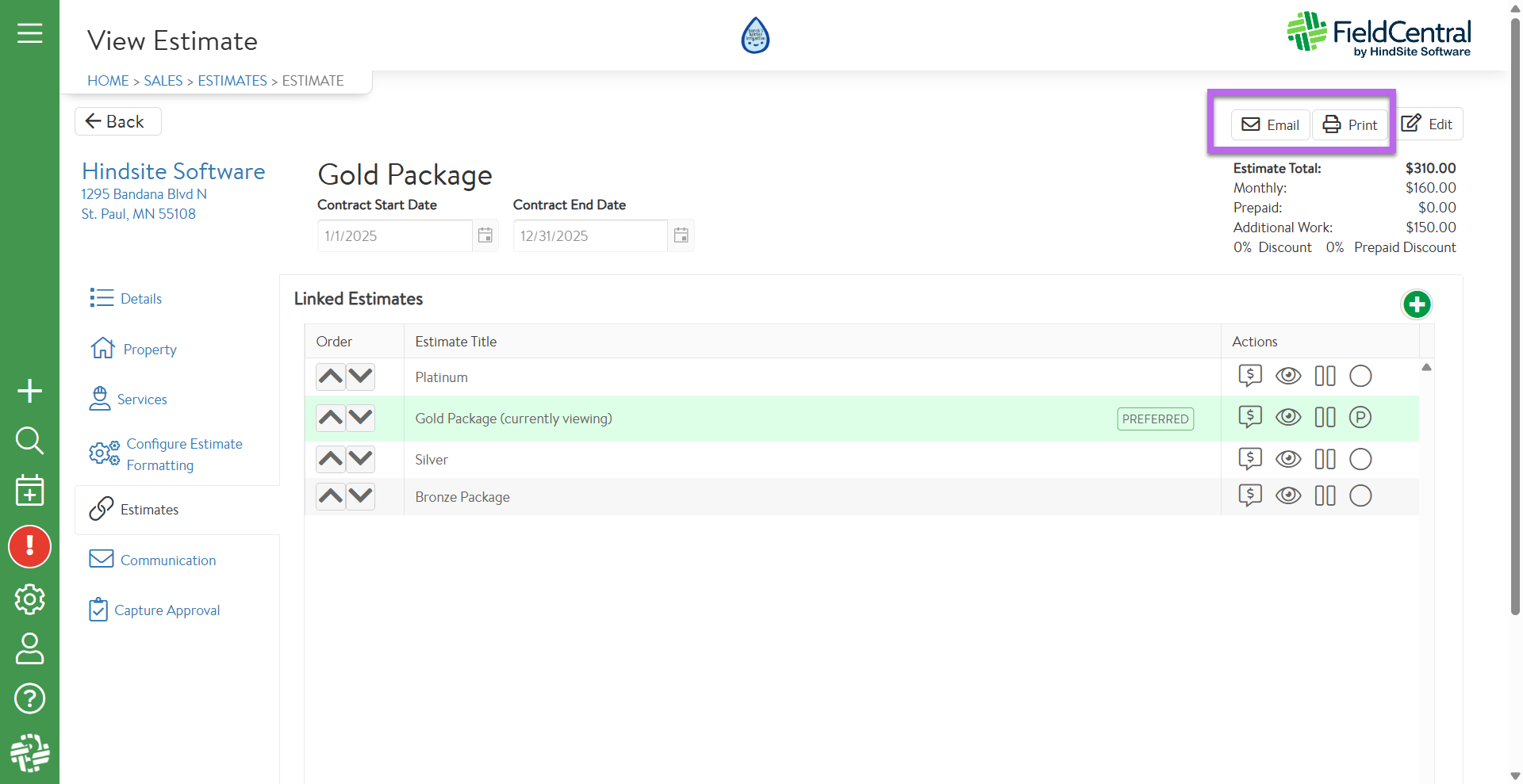 Now that the client has approved an estimate, the estimate is automatically converted to a contract within FieldCentral. From here the contract can be further managed within the Contracts Section (Sales & Est. > Contracts)