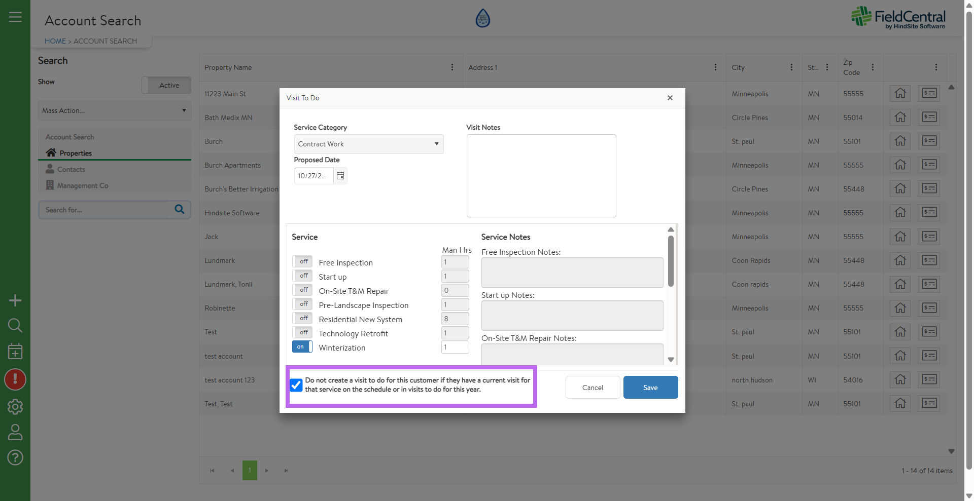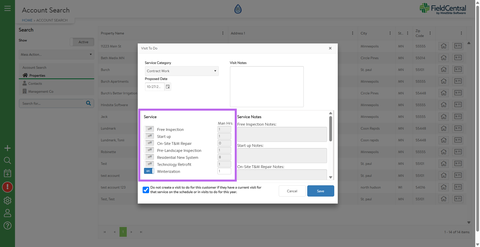 The “Visit To Do” modal will populate and the user will select which service they would like to create for all properties on their list.