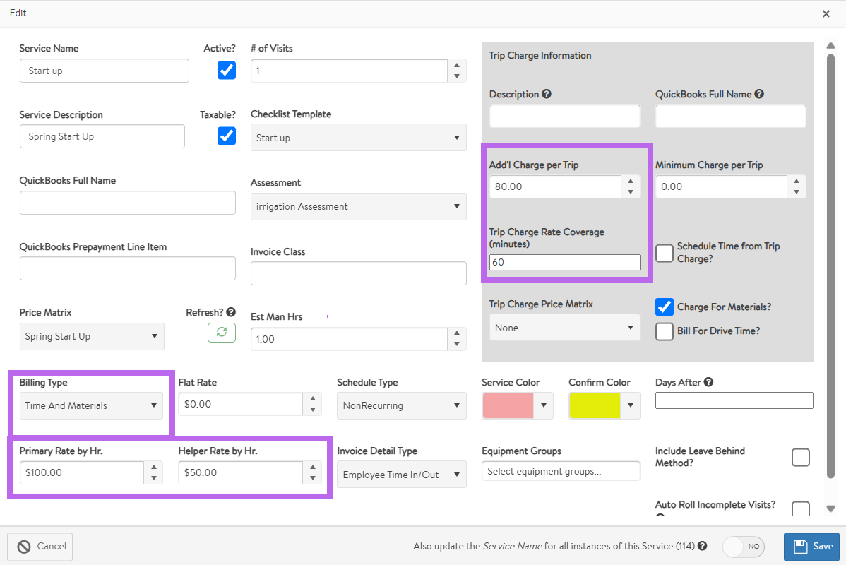 The next scenario we’ll cover is to use a Trip charge to essentially bill a flat rate charge that’s covered by a set amount of time. The setup would look like this: