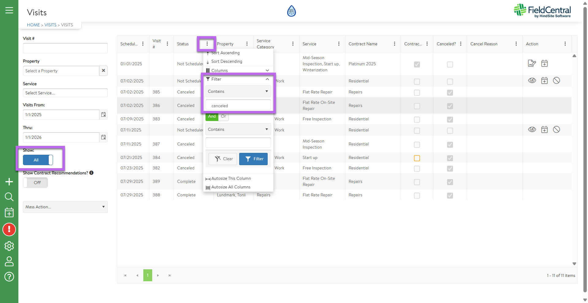On the left select show all visits. The toggle should be blue and say all. Use the 3 lines on the status column to filter “Canceled” so it is displaying the information needed.