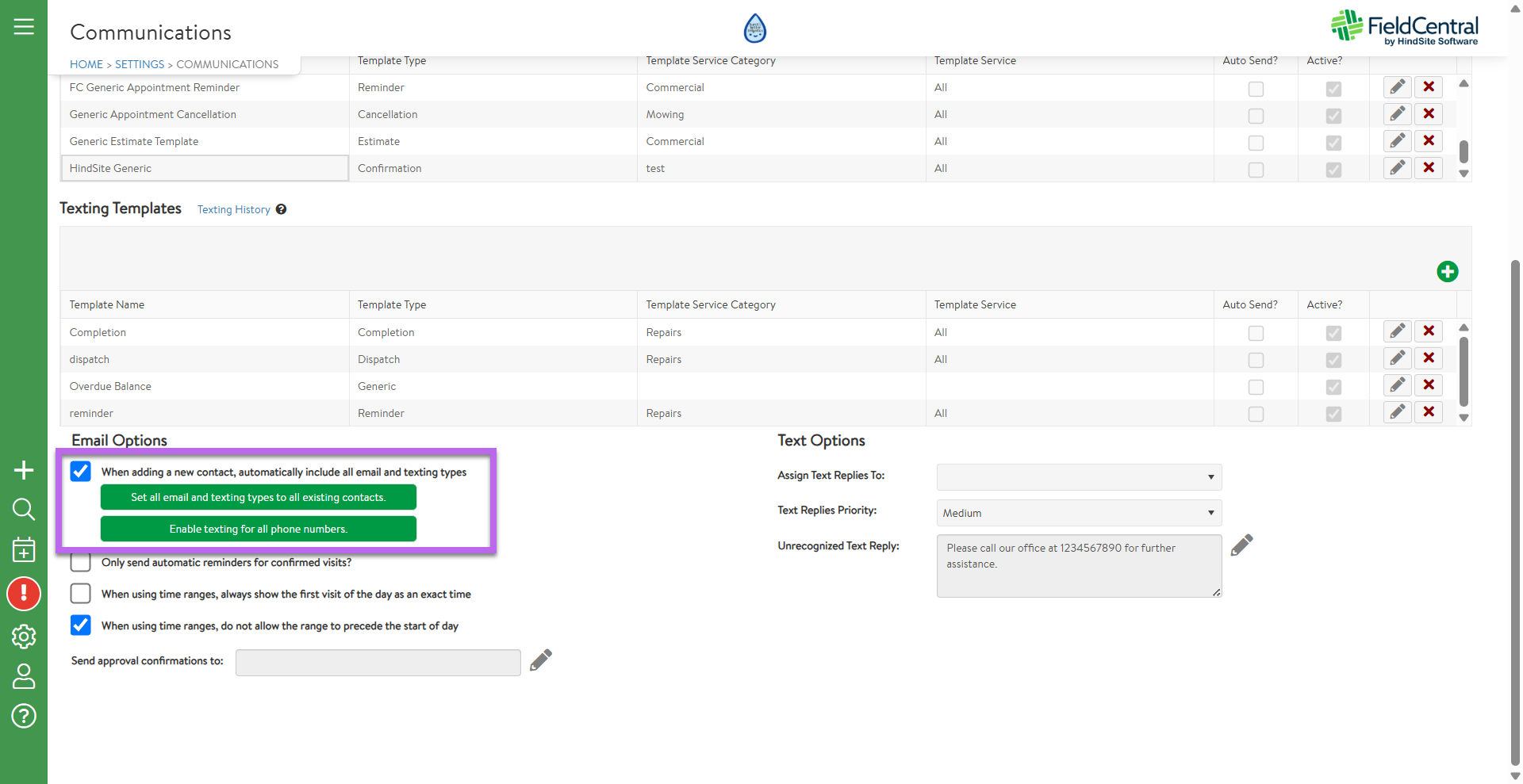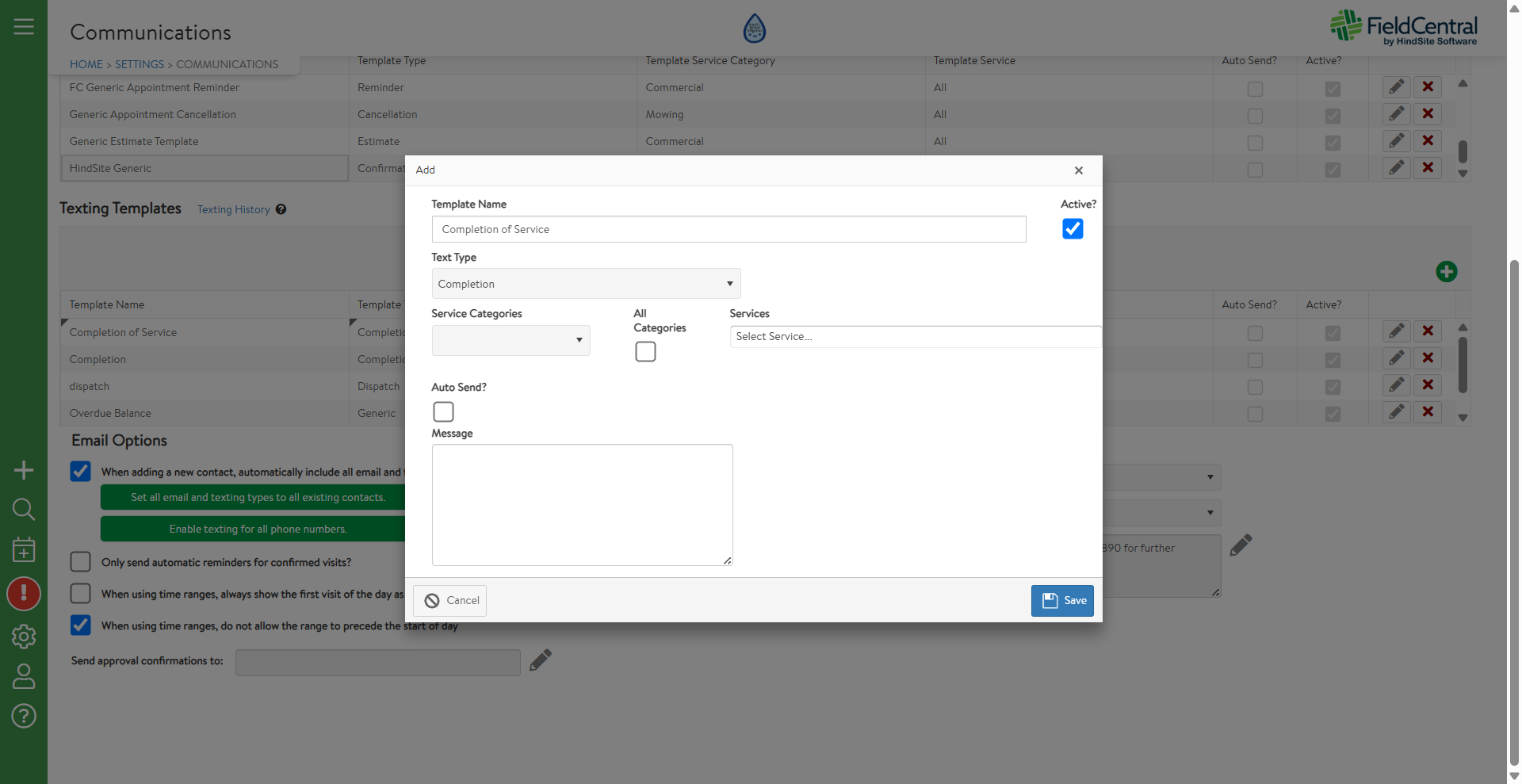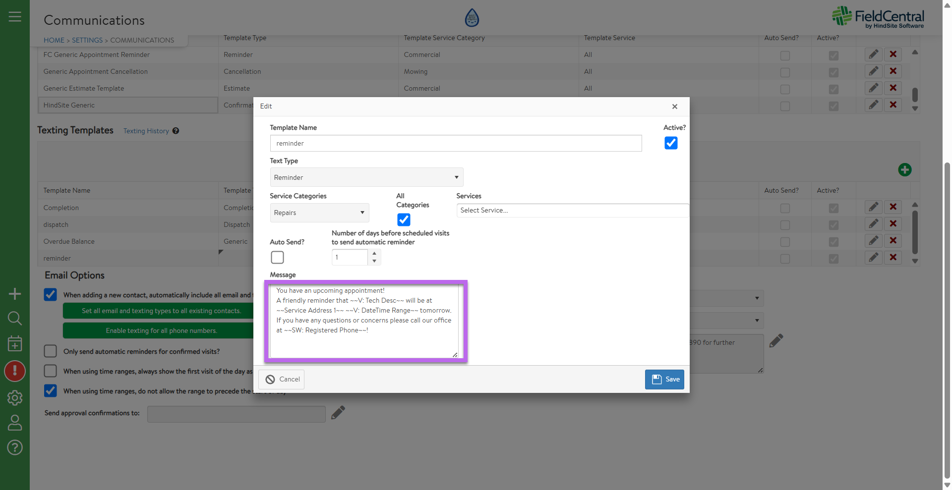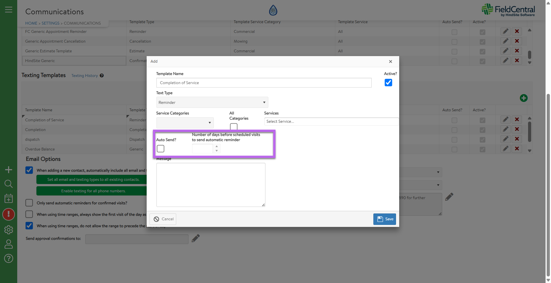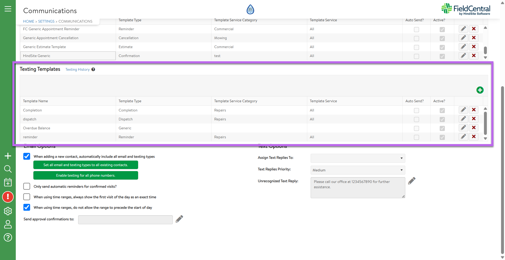 Texting Templates that are marked as ‘Auto Send’ will send out text messages by FieldCentral based on unique triggers for each Texting Template Type (e.g. reminder, dispatch vs. Completion).