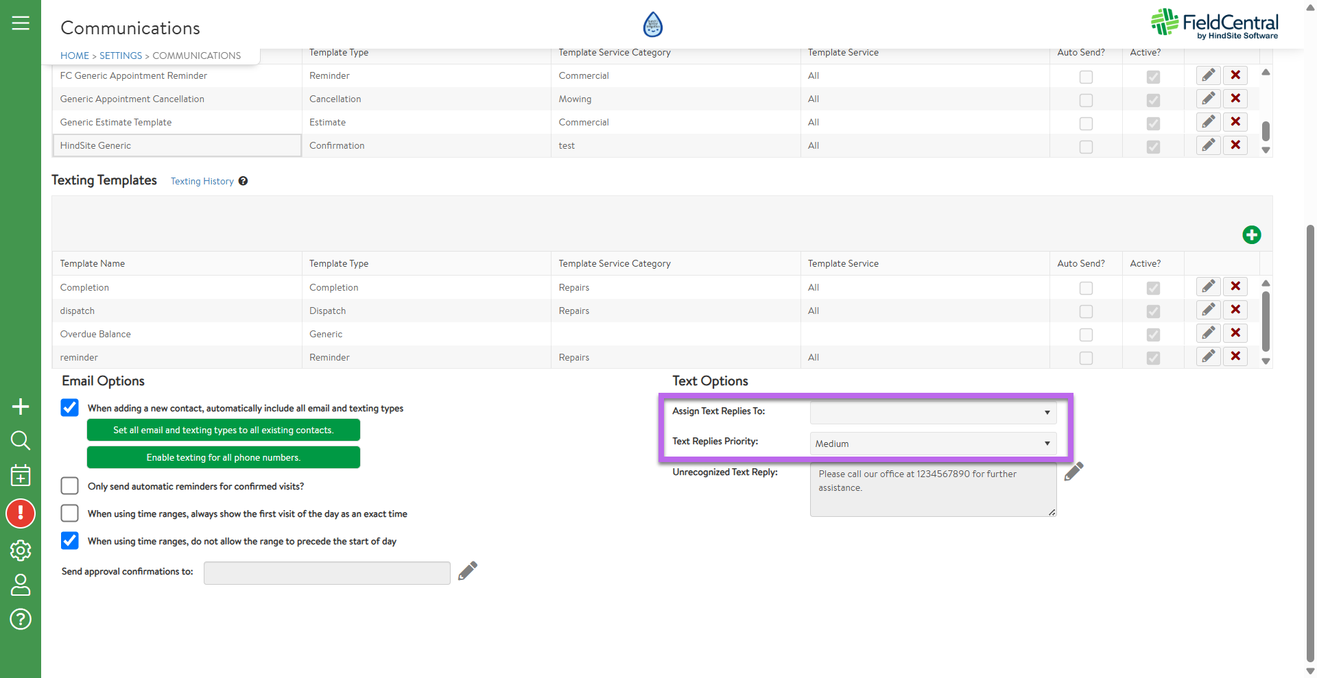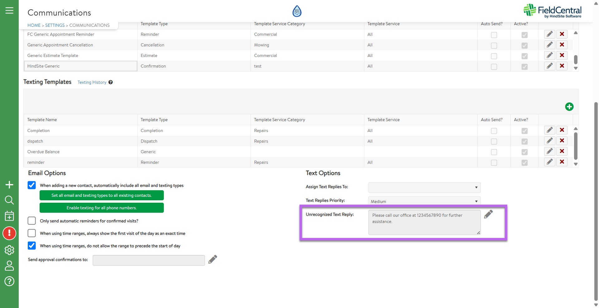 While not encouraged, Customers may respond to a given text sent from FC. Two-way chat is not yet available in FC, but we will still log the text (see “Texting Log” section below) and FC will send an automated response back to the Customer to alert them that text chats are not monitored. This auto-response can be configured in the Settings > Communications area of FC under the ‘Unrecognized Text Reply’ area.