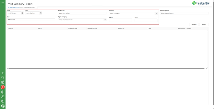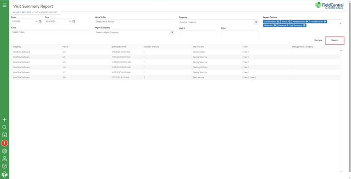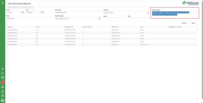 The Visit Summary Report produces a generated document with detailed information for visits that are on the schedule in FieldCentral.