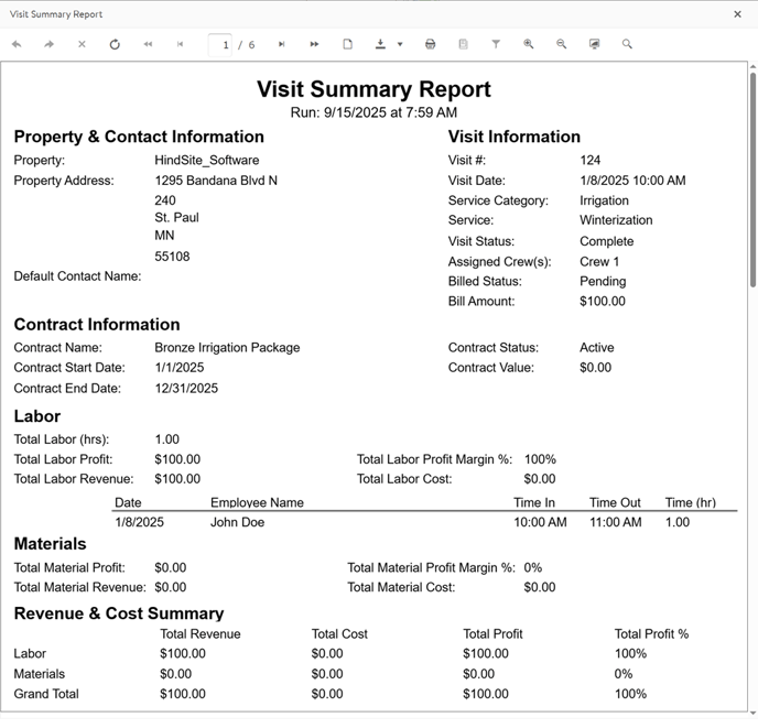 Optional section that will display the dollar summary of the labor & material revenue, cost and profit. If an override was applied to the visit, that information will also display.